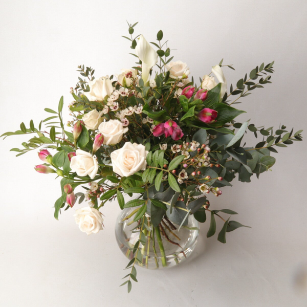 Ein sensationeller Blumenstrauss mit sanften Farben, für einen besonderen Moment. Polyantha-Rosen rosa, Calla, Alstromerien, Waxblumen, Eucalypthus, Lentisco.
