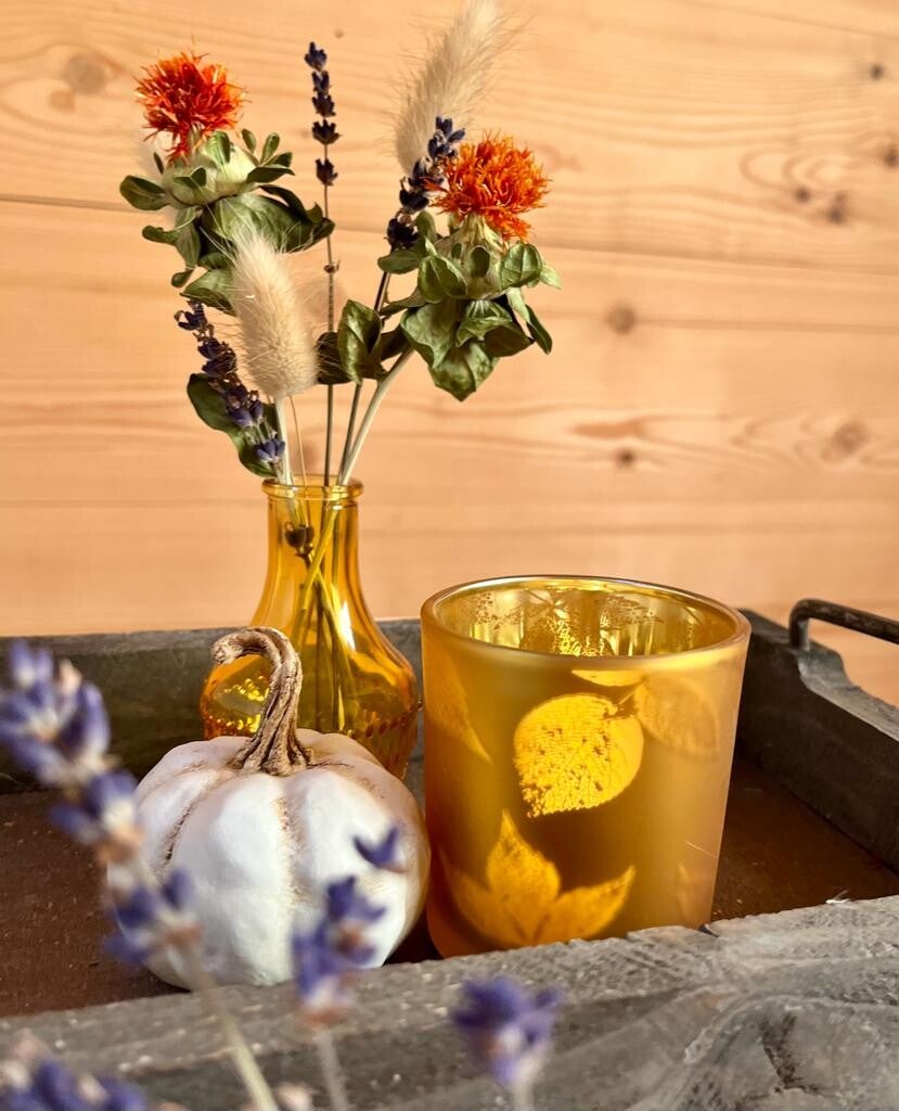 Milchiges Glas (8x7 cm) mit Blättern. Im Kerzenschein kommt das Motiv besonders gut zum Vorschein.