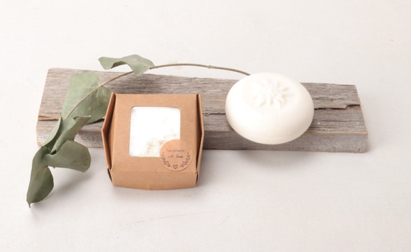 Milde Qualitätsseife aus Ziegenmilch und Hautpflegendem Glycerin. Mit Gardenia Duft und edlem Edelweiss Motiv.